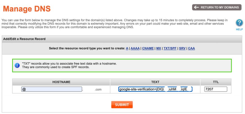 hostname 填 @,Text 那里填从 GSC 复制过来的代码,然后 submit