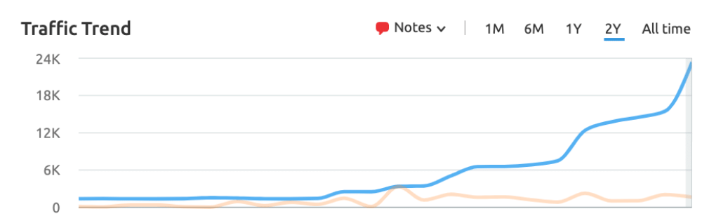 拿 semrush 看一眼最近 2 年这个域名的自然流量情况。发现从 2020 年 1 月开始上升,最近两个月增长很多,在 SEO 上发力了。