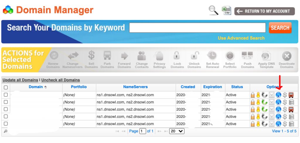 以 Namesilo 为例,登录后进入 Domain Manager,找到该域名,点击解析(图标为蓝色小球)